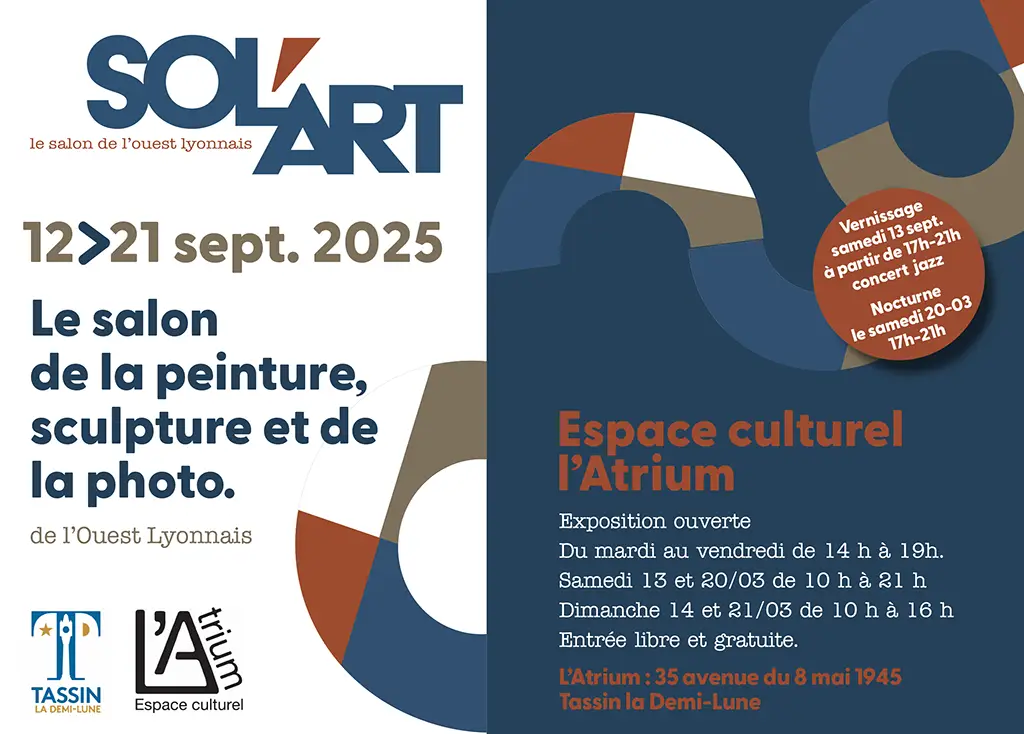 Fruit d’un travail associatif de qualité, le salon SOL’ART, historique et incontournable rendez-vous annuel artistique soutenu par la ville de Tassin-la-demi lune est de retour… Monde d’aprés et nouvelle équipe pour donner des envies nouvelles et proposer les regards neufs de 30 artistes heureux de retrouver des visiteurs impatients.