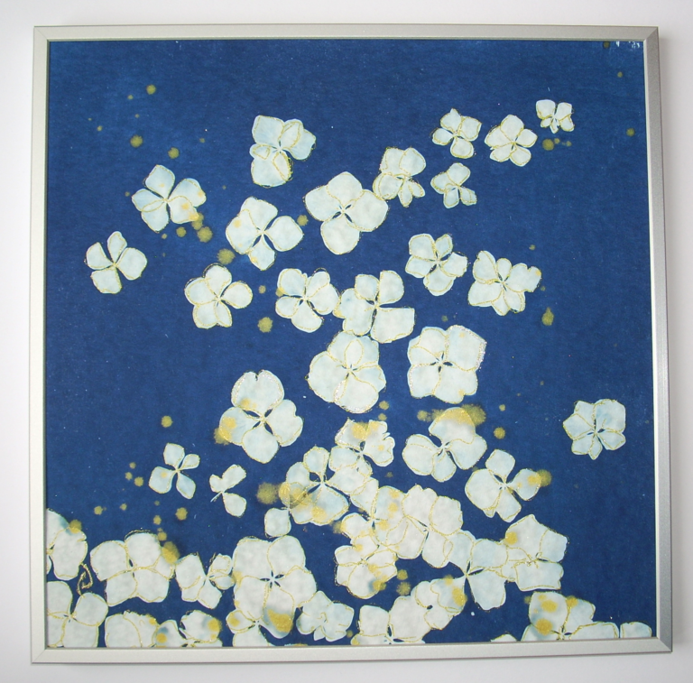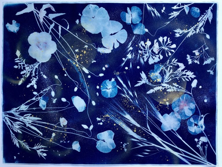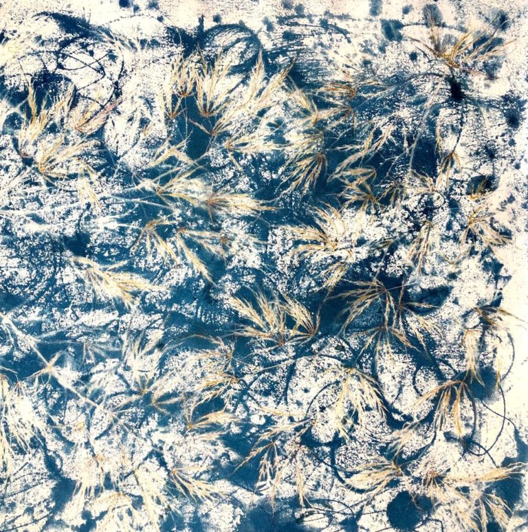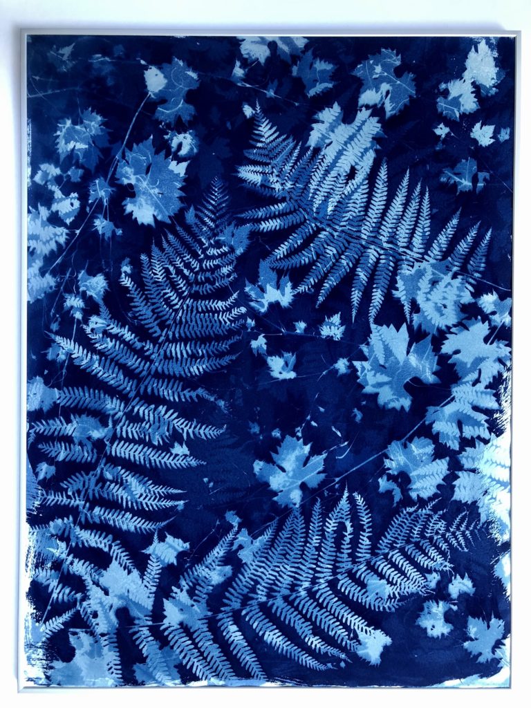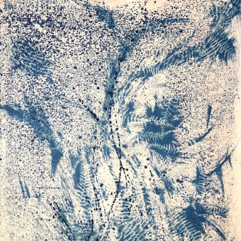 Après quelques tableaux à l’huile et des études en Histoire de l’Art, je me suis consacrée à ma famille, tout en apportant ma collaboration à l’Atelier d’architecture de mon mari, laissant de côté tubes et pinceaux. Les cinq enfants ont grandi et depuis 2015, j’ai fait le choix de devenir autoentrepreneur dans le secteur de la décoration sur tout support pour présenter mes créations sur les marchés artisanaux et les marchés de Noël. Mon premier attrait a été pour la VERRERIE DECOREE. Je procède par collage pour décorer assiettes et plats en verre de fabrication française, j’utilise un vernis-colle de fabrication française et répondant aux normes environnementales. Les décors sont réalisés avec des fils de soie, de viscose, du lurex, avec des nervures de feuilles, complétés de paillettes, de peintures et une finition papier murier, pour un résultat très coloré. Mon deuxième pôle d’activités est le CYANOTYPE Lors d’une exposition de peinture fin octobre 2020, mon regard a été accroché par des CYANOTYPES. Tellement séduite par ses bleus et avec les explications du procédé que j’ai essayé et je me suis prise au jeu. J’ai commencé, sous une lampe de lumière noire, le rayonnement du soleil d’hiver étant trop faible, avec quelques petits formats pour agrémenter des cartes postales. J’ai fait beaucoup de recherches et d’essais, avec une frénésie créatrice, petit à petit les dimensions ont augmenté pour devenir tableaux. Je reste toujours dans le même esprit de BLEU avec des éléments pris dans la nature, conservés tels que la nature nous les offre, travaillés pour ne garder que les nervures des feuilles ou parfois détournés de leur image initiale.